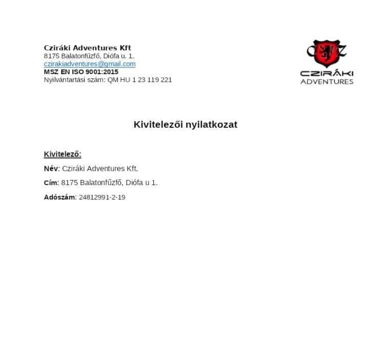 Amennyiben Ön is olyan partnert keres, aki magas színvonalon, precíz munkavégzéssel és széleskörű tapasztalattal támogatja projektje sikerét, örömmel állunk rendelkezésére. További információért és referenciáinkért látogasson el honlapunkra: www.czirakiadventures.hu, vagy vegye fel velünk a kapcsolatot az alábbi elérhetőségeken.