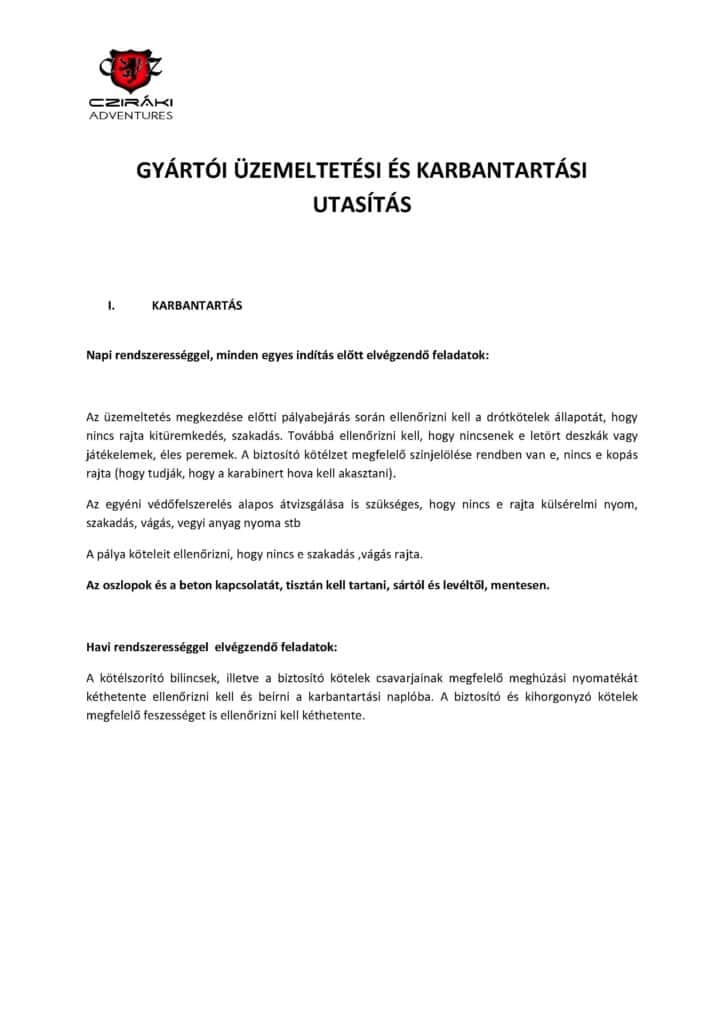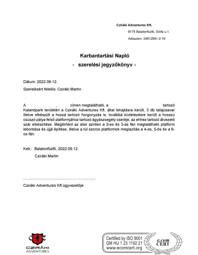 Ezek a dokumentumok biztosítják a kalandpark biztonságos és gördülékeny működését, valamint az üzemeltetők számára az előírásoknak megfelelő működést